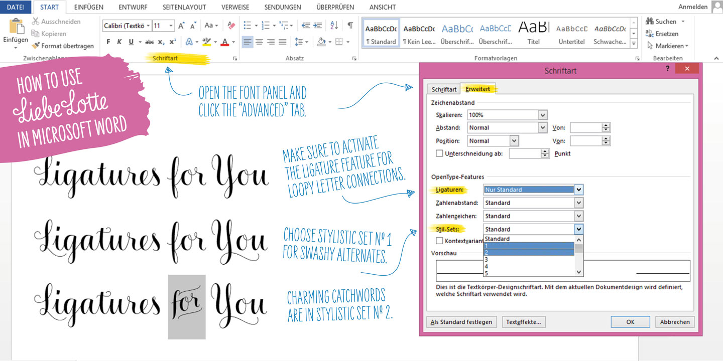 Of course LiebeLotte Swell comes with a state-of-the-art character set. She also sports a variety of ligatures and alternative forms, available through OpenType features.